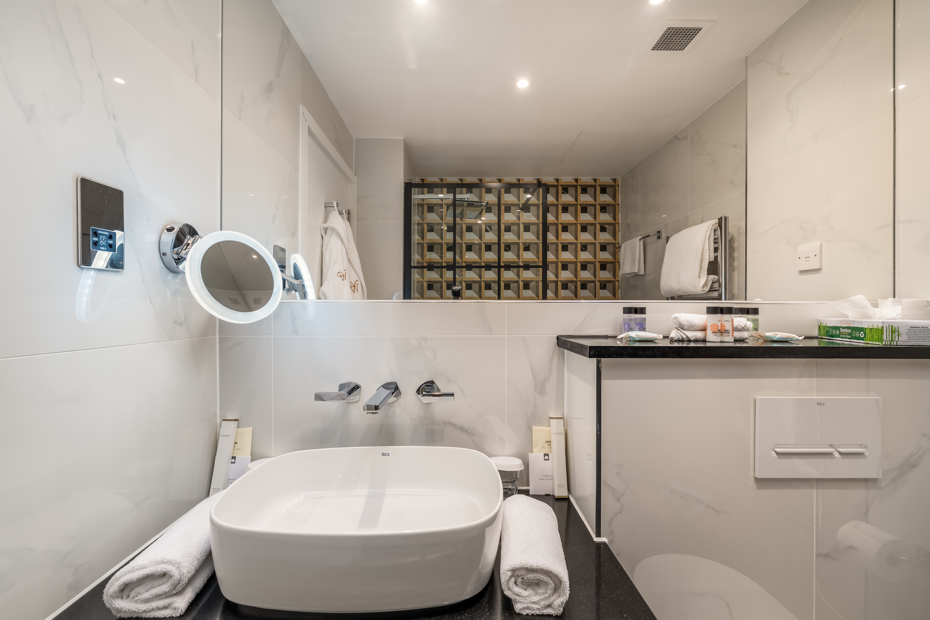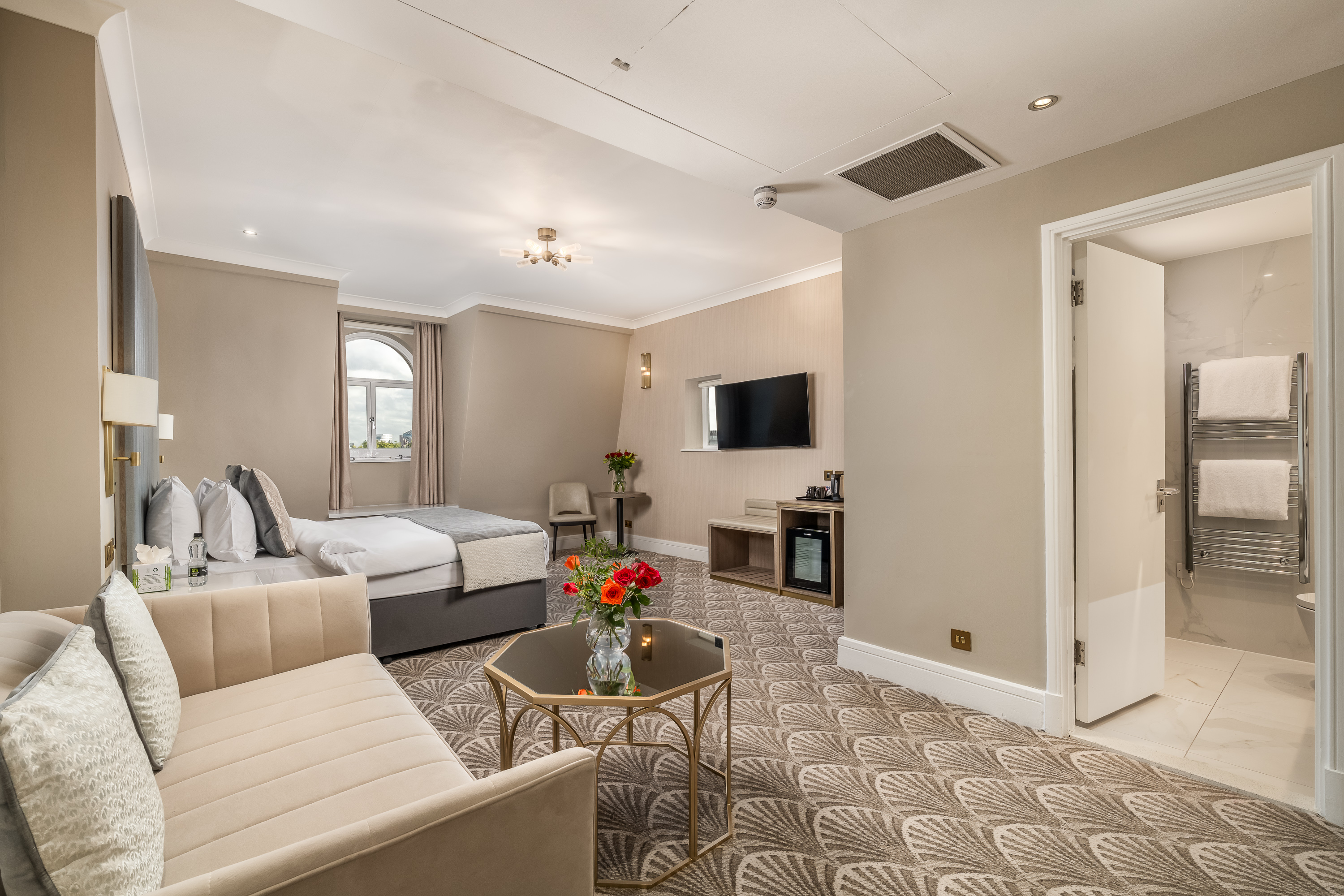 The Executive Suites are open plan rooms which can be set up with either a king size bed or two single beds. They have a comfortable sitting area and most can be connected with the room opposite or next door to create a private two room suite. Each has a 42 inch flat screen wall mounted TV. Bathrooms feature opulent terracotta marble and offer a bath with power shower.